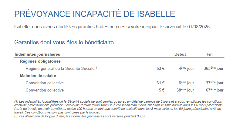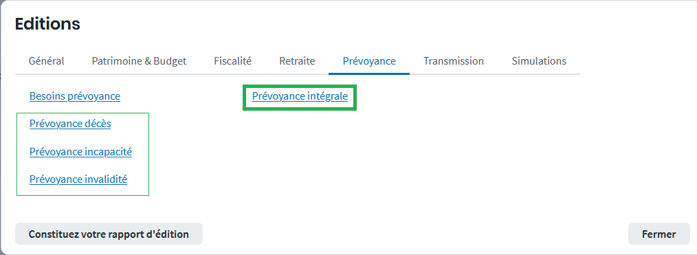 Accessible via Éditions > Prévoyance, l’édition Prévoyance intégrale offre une analyse détaillée des garanties en cas de décès, d’incapacité ou d’invalidité.