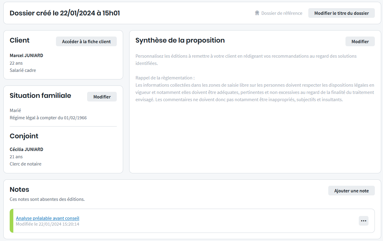 Cliquez sur Ajouter une note pour saisir les renseignements et notes que vous pourrez consulter et mettre à jour lors de la découverte de la situation et du patrimoine du client et de son conjoint.