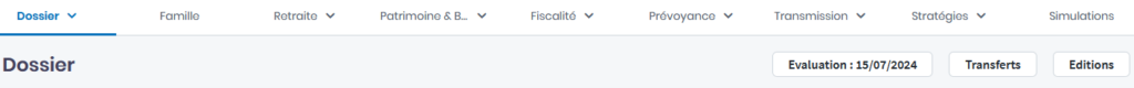 Dans la partie supérieure de la page, une barre de menu d’accès rapide permet de naviguer directement entre l’accueil et les différentes rubriques et sous-rubriques du dossier dans lesquelles vous renseignez les données du client (et de son conjoint) permettant de réaliser des calculs et simulations . Il est également possible, via Stratégies, d’accéder aux Objectifs & Préconisations ainsi qu’au Profil d’investisseur.