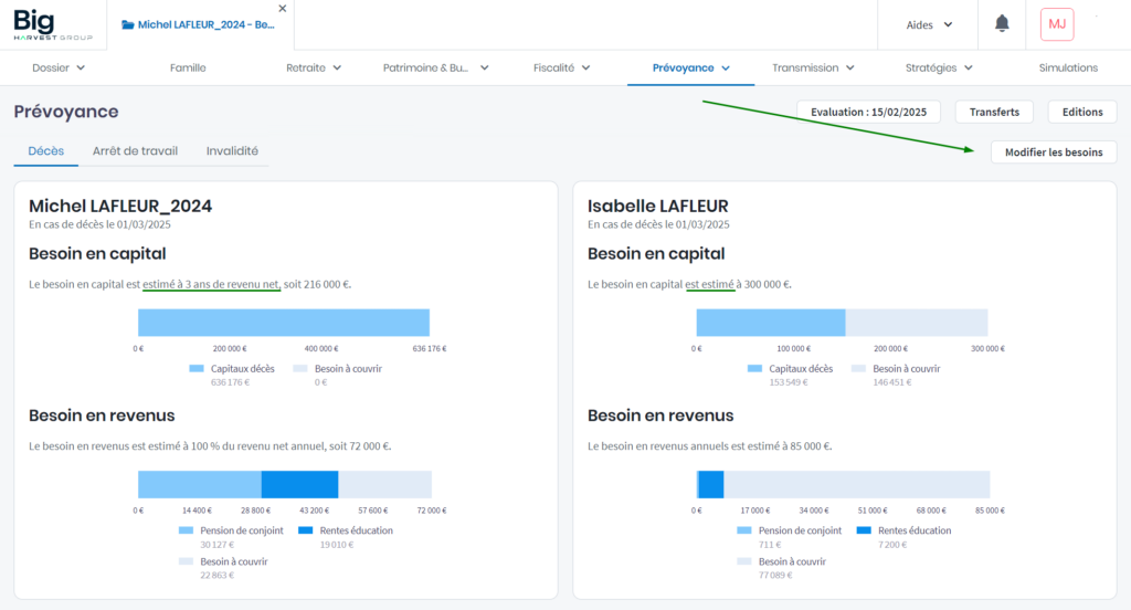 Désormais, un bouton Modifier les besoins offre la possibilité d’ajuster ces estimations afin d’indiquer des montants correspondant à la situation de votre client, notamment dans le cas des personnes retraitées dont les besoins ne sont pas estimés.