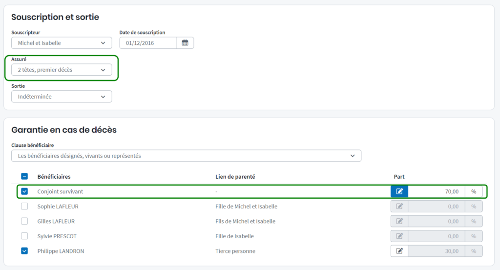 Dans les contrats d’assurance ayant pour assuré « 2 têtes, premier décès », dans la liste des bénéficiaires, le choix Conjoint survivant désigne le client ou le conjoint selon l’ordre des décès retenus dans la succession.