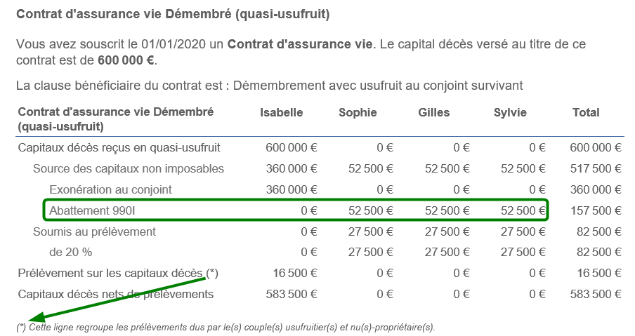 Dans l’exemple ci-dessous, l’abattement 990I restant s’impute sur le contrat avec clause démembrée.