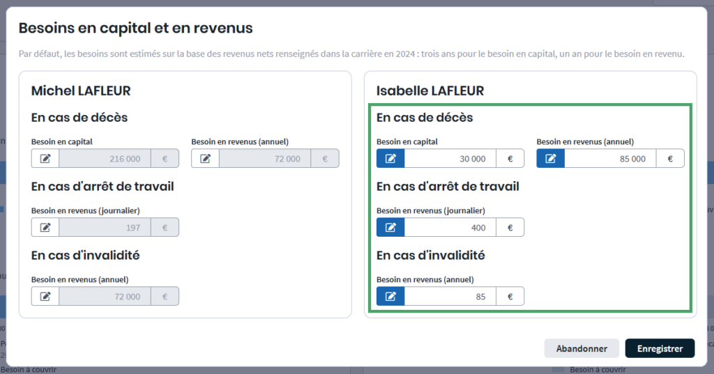 Dans la section « Prévoyance », afin de vous donner un repère, les besoins en cas de décès, d’arrêt de travail et d’invalidité sont estimés sur la base des revenus renseignés dans la carrière.