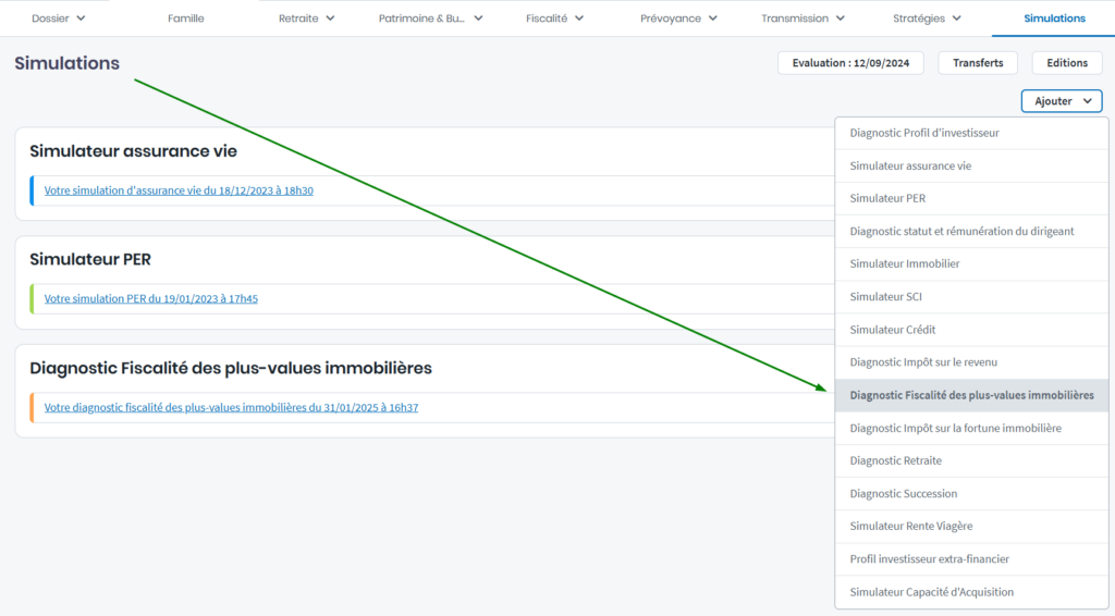 Le simulateur « Diagnostic Fiscalité des plus-values immobilières » est accessible depuis l’onglet Simulations d’un dossier. Vous pouvez ainsi conserver les estimations réalisées pour chacun de vos clients.