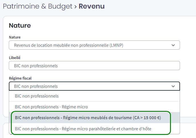 Nous avions intégré le texte discuté lors des débats sur la loi de finances 2024 mais au regard des formulaires reçus, nous avons dû ajuster Big pour leur correspondre. Dans les revenus des locations meublées, vous retrouvez les choix ci-dessous que ce soit dans le patrimoine de Big ou dans le simulateur immobilier.
