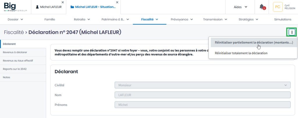 - Réinitialiser partiellement la déclaration : seuls les montants sont supprimés mais l’ensemble des autres saisies sont conservées (listes des revenus perçus…).