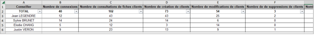 Dans le fichier Excel, pour faciliter la consultation, chaque ligne correspond à un utilisateur et chaque colonne à un indicateur.