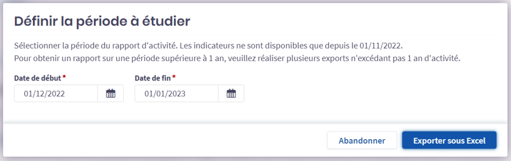 Seules deux informations sont à renseigner : les dates de début et fin de la période à étudier. Les indicateurs sont ensuite restitués dans un fichier excel.