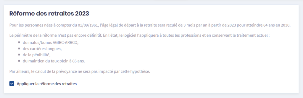 Dans la section « Hypothèses » de l’onglet Retraite, une nouvelle option permet d’intégrer la réforme prévue en 2023 dans l’estimation de la retraite du client et du conjoint. Lorsque cette hypothèse est activée, l’âge légal de départ en retraite est reculé de 3 mois par an à compter de 2023, pour atteindre 64 ans en 2030.