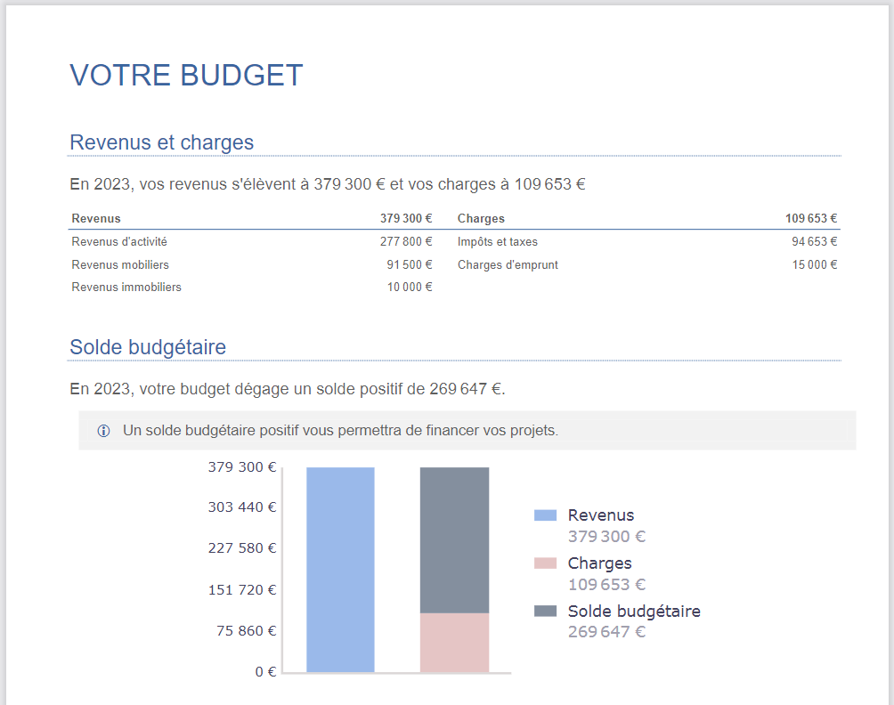 Afin de se rapprocher de la situation réelle de votre client, le graphique « Solde budgétaire » est désormais dynamique en s’ajustant aux montants des revenus et charges renseignés.