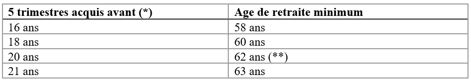 (**) L’âge de retraite minimum augmente progressivement d’1 trimestre en fonction de la date de naissance :