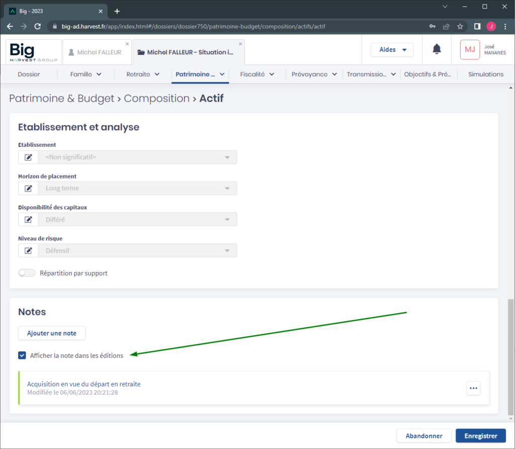 Pensez à cocher la case « Afficher les notes dans les éditions » pour intégrer les notes de l’actif consulté dans la page Votre patrimoine