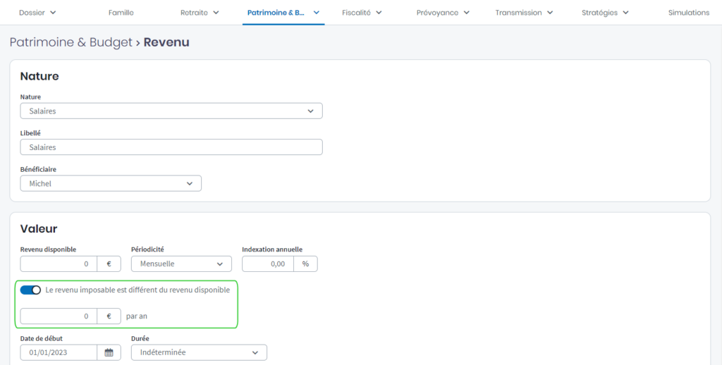 La fonctionnalité est accessible en activant le switch Le revenu imposable est différent du revenu disponible puis en saisissant la valeur imposable du revenu. Dans le cas contraire, vous retrouvez le fonctionnement habituel, à savoir le revenu disponible est transféré dans la déclaration.