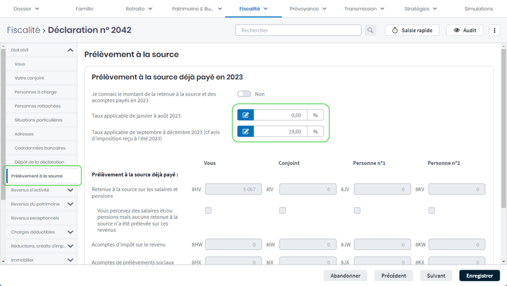 Big estime les taux de prélèvement à la source en fonction des informations renseignées. Modifier le taux dans la déclaration n°2042 interrompait les transferts entre le patrimoine et cette déclaration. Afin de laisser le transfert actif, la modification des taux ou du montant du prélèvement à la source n’entraine plus la désactivation des transferts.