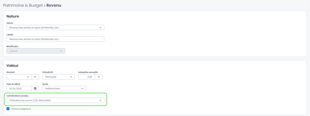 Avec le prélèvement à la source, le revenu imposable est toujours différent du revenu perçu. Pour faciliter vos saisies, Big propose de renseigner cette distinction directement dans l’onglet « Patrimoine & budget » sans devoir vous rendre dans la déclaration n°2042 et interrompre l’alimentation de cette déclaration (figer).