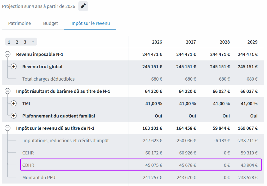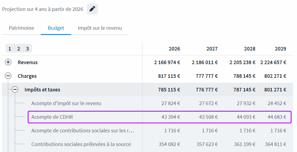 De façon à montrer l’impact de la CDHR sur le budget, l’acompte est présenté dans les charges de l’onglet « Patrimoine & Budget » et dans la projection du budget.