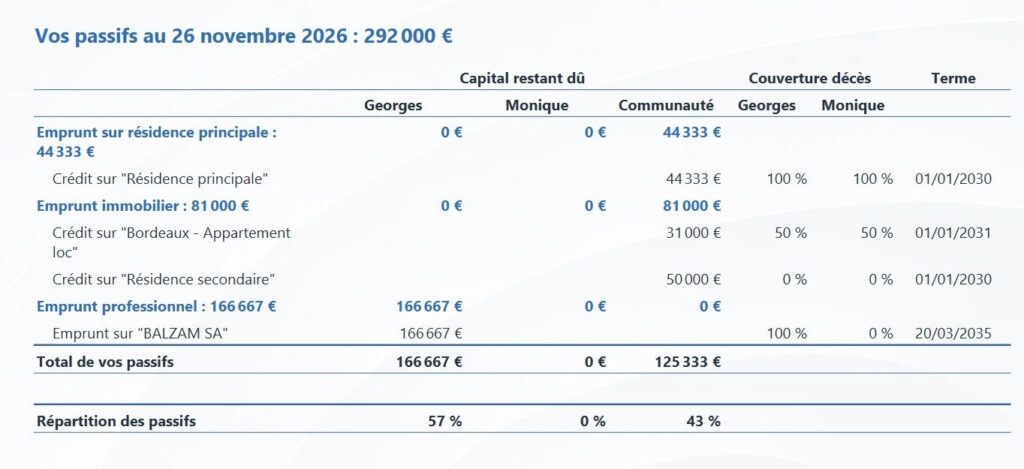 Pour compléter la vision patrimoniale dans l’édition « Synthétique & pédagogique », un tableau donne une vue d’ensemble des emprunts souscrits par vos clients. Le capital restant dû par souscripteur est indiqué à la date d’évaluation du dossier, et ce pour chaque prêt. Le taux de couverture en cas de décès est aussi rappelé pour mettre en avant un éventuel manque, ainsi que le terme du crédit afin d’identifier une opportunité de nouveau financement.