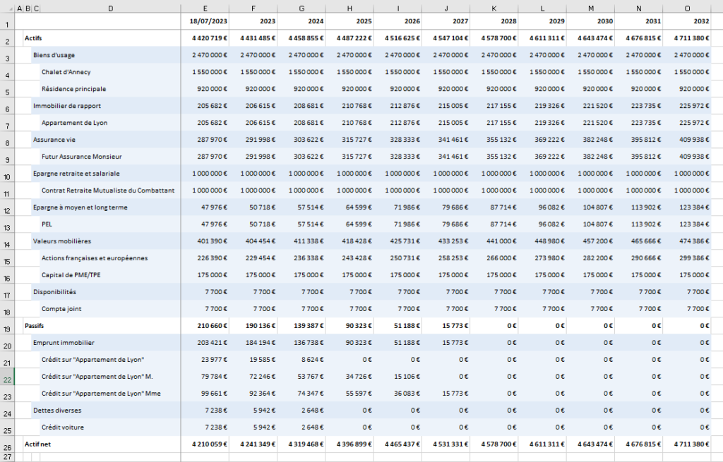Disposer des données de la projection du patrimoine et du budget sous Excel, vous permet d’ajuster la présentation ou éventuellement de calculer des montants qui vous sont propres.