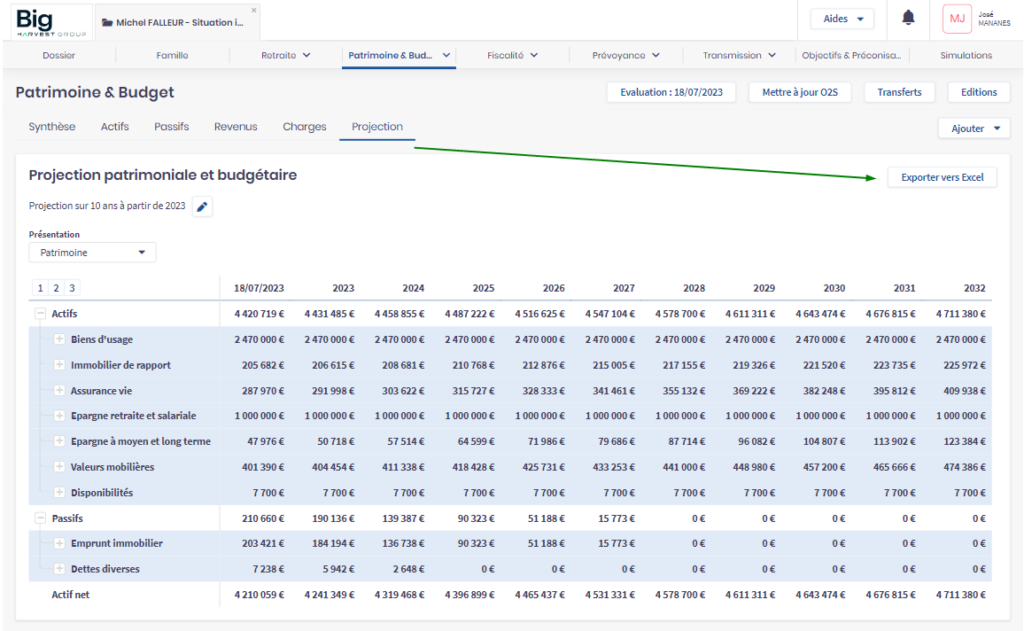 Dans l’onglet « Projection », le bouton Exporter vers Excel génère un fichier « xlsx » présentant le contenu de l’écran en cours de visualisation. Ainsi si vous souhaitez exporter l’évolution du patrimoine ou du budget, il faudra positionner la liste « Présentation » sur « Patrimoine » ou « Budget »