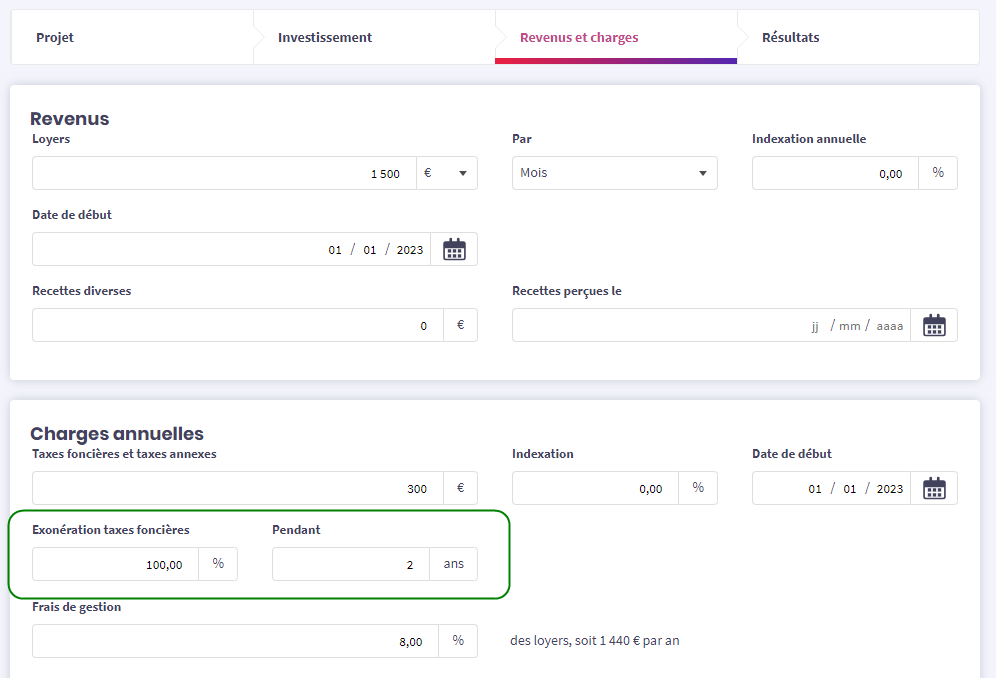 Réaliser des simulations plus précises en renseignant la part et la durée de l’exonération de la taxe foncière dans le bloc Charges annuelles de votre simulation.