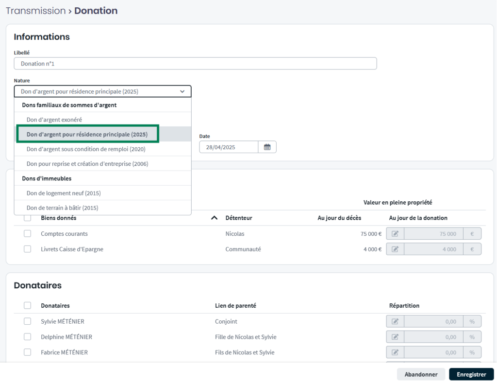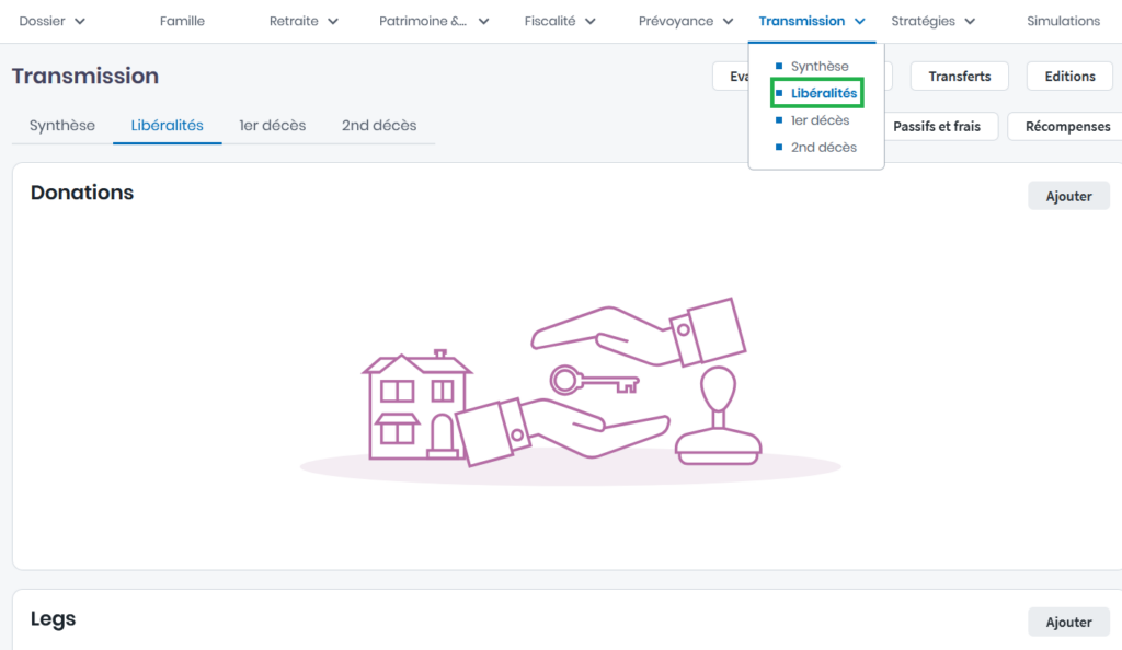 Saisissez-la dans l’écran Libéralités, accessible depuis l’onglet Transmission > Libéralités.