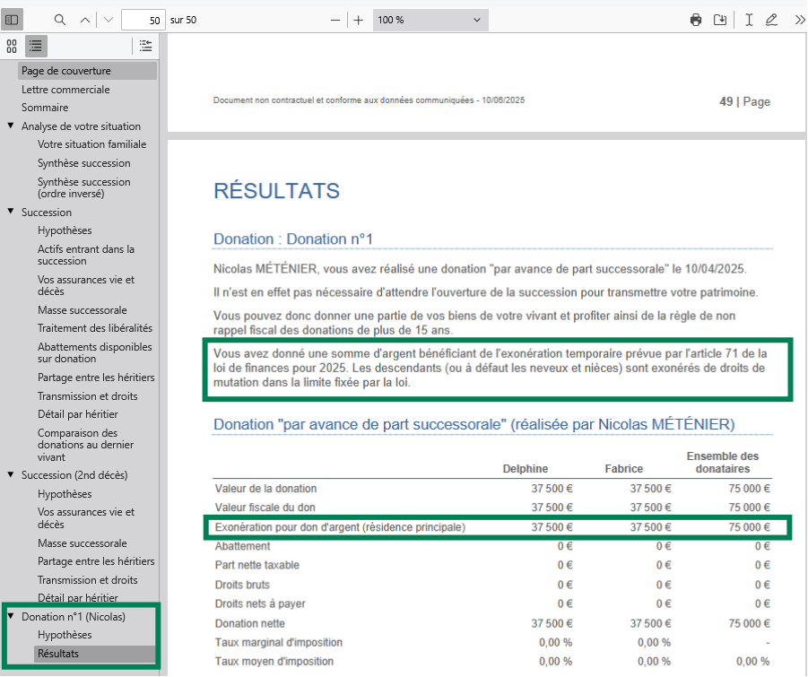 Vous retrouverez ensuite dans la page « Résultats » des éditions « Donation » un rappel du cadre fiscal applicable ainsi que le détail des calculs : valeur de la donation, montant exonéré ou encore droits de donation à payer.