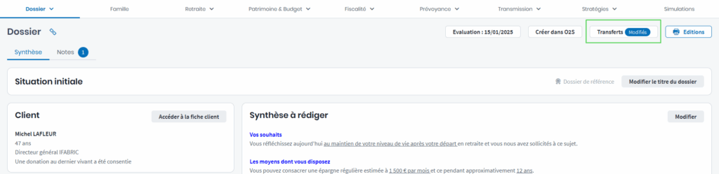 Afin d’attirer votre attention quand les informations du dossier n’alimentent plus les déclarations, la mention « Modifiés » apparaît sur le bouton Transferts dès que vous renseignez des données dans l’une des déclarations n°2042, n°2044, IFI.
