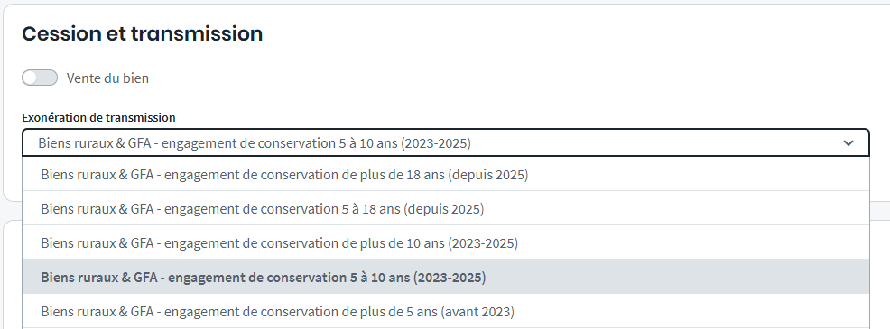 Dans les actifs de type Biens ruraux loués à long terme ou Parts de GFA, GAF, GFV et GFR, retrouvez dans la section Cession et transmission, les différentes durées d’engagement de conservation regroupées dans la liste déroulante Exonération de transmission.