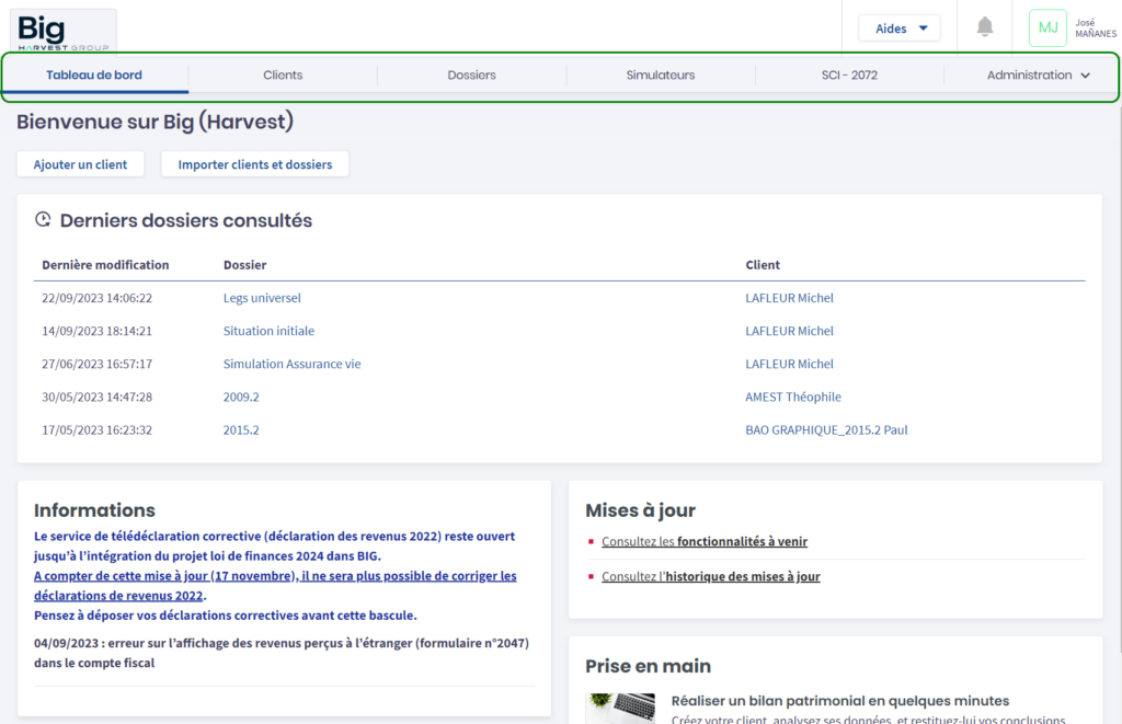 Faciliter la navigation dans Big pour un meilleur confort d’utilisation est une préoccupation quotidienne. Dans cet optique, nous débutons un lot d’améliorations en commençant par le tableau de bord. Contrairement au dossier dans lequel la navigation entre onglets est horizontale, l’accès à la liste des clients, des dossiers ou des simulateurs se faisait à l’aide d’une barre verticale sur la gauche dans le tableau de bord :