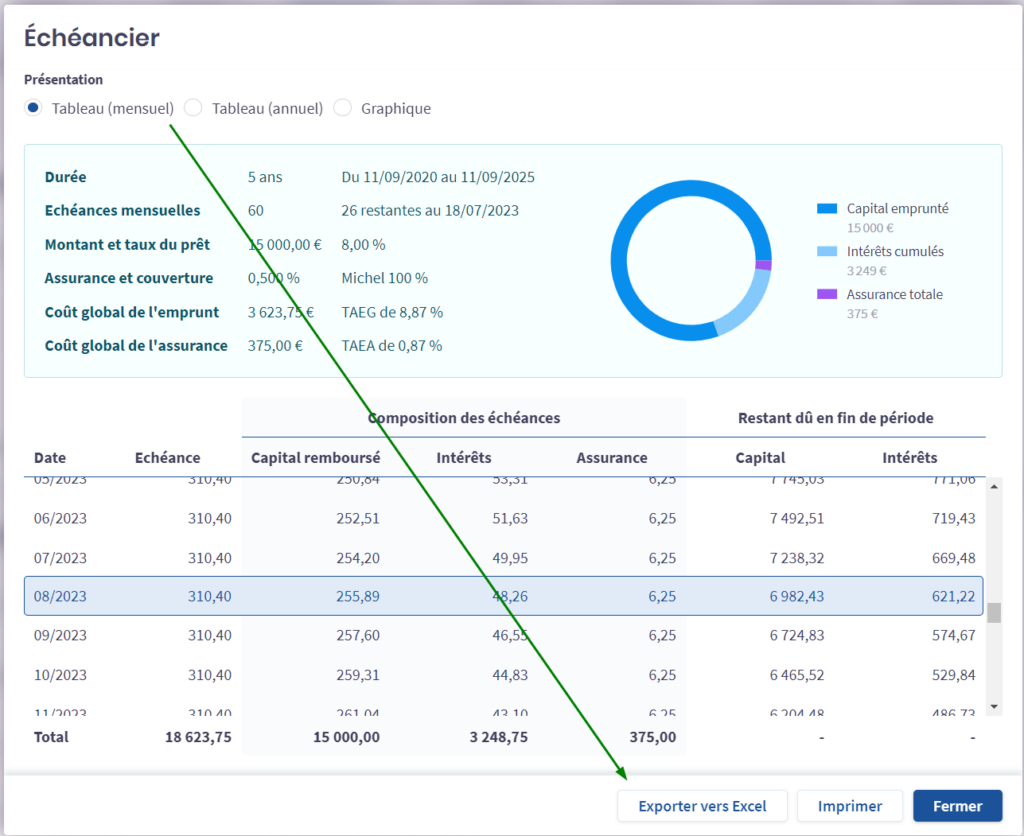 L’export Excel est une fonctionnalité que vous appréciez, nous la réintroduisons progressivement. Ainsi dans l’écran Echéancier, un bouton « Exporter vers Excel » génère un fichier Excel dont le contenu est l’échéancier mensuel ou annuel selon le choix sélectionné dans l’écran.