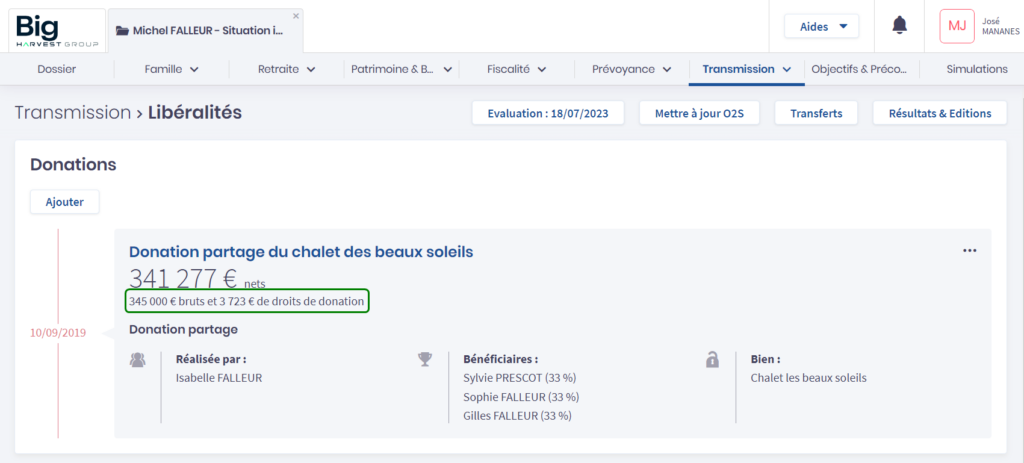 Pour éviter toute confusion sur le montant affiché, nous présentons dans l’écran Libéralités les valeurs nette et brute des donations. Le rappel des droits de donation est aussi un plus qui vous fait gagner du temps alors que la valeur brute rappelle la valeur de rapport de la donation.
