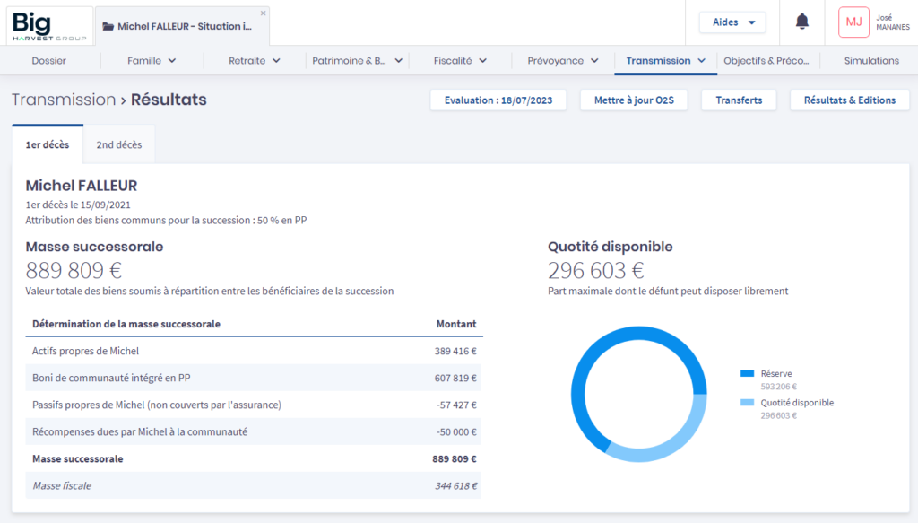 Avec le calcul de la masse successorale, nous initions l’ajout de résultats plus détaillés à l’écran dans la transmission. En cliquant sur le bouton Résultats de l’onglet Transmission, vous visualisez la décomposition de la masse successorale, la masse fiscale et la quotité disponible est mise en avant.