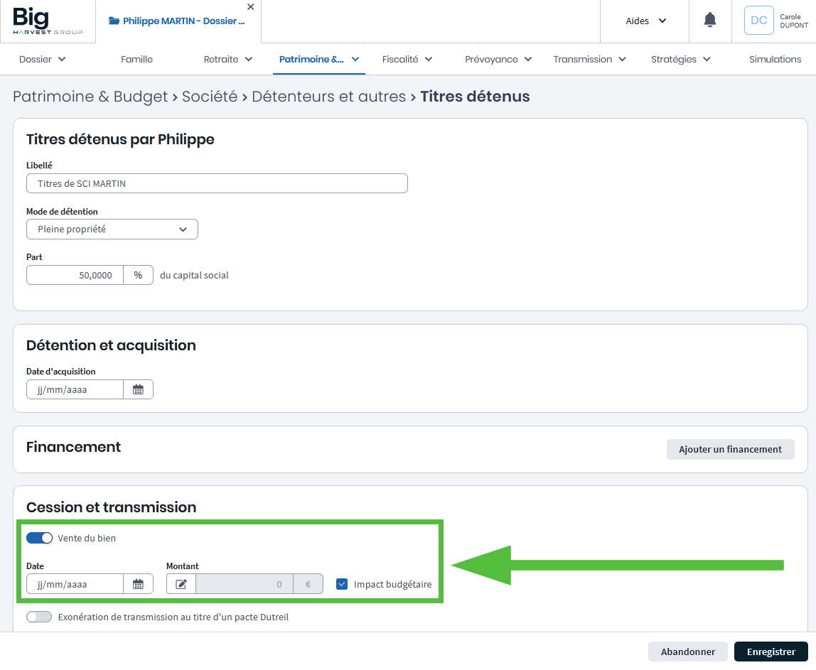 Sur une ligne de titres, dans la section « Cession et transmission », il est désormais possible de saisir une cession de titres en cliquant sur « Vente du bien« .