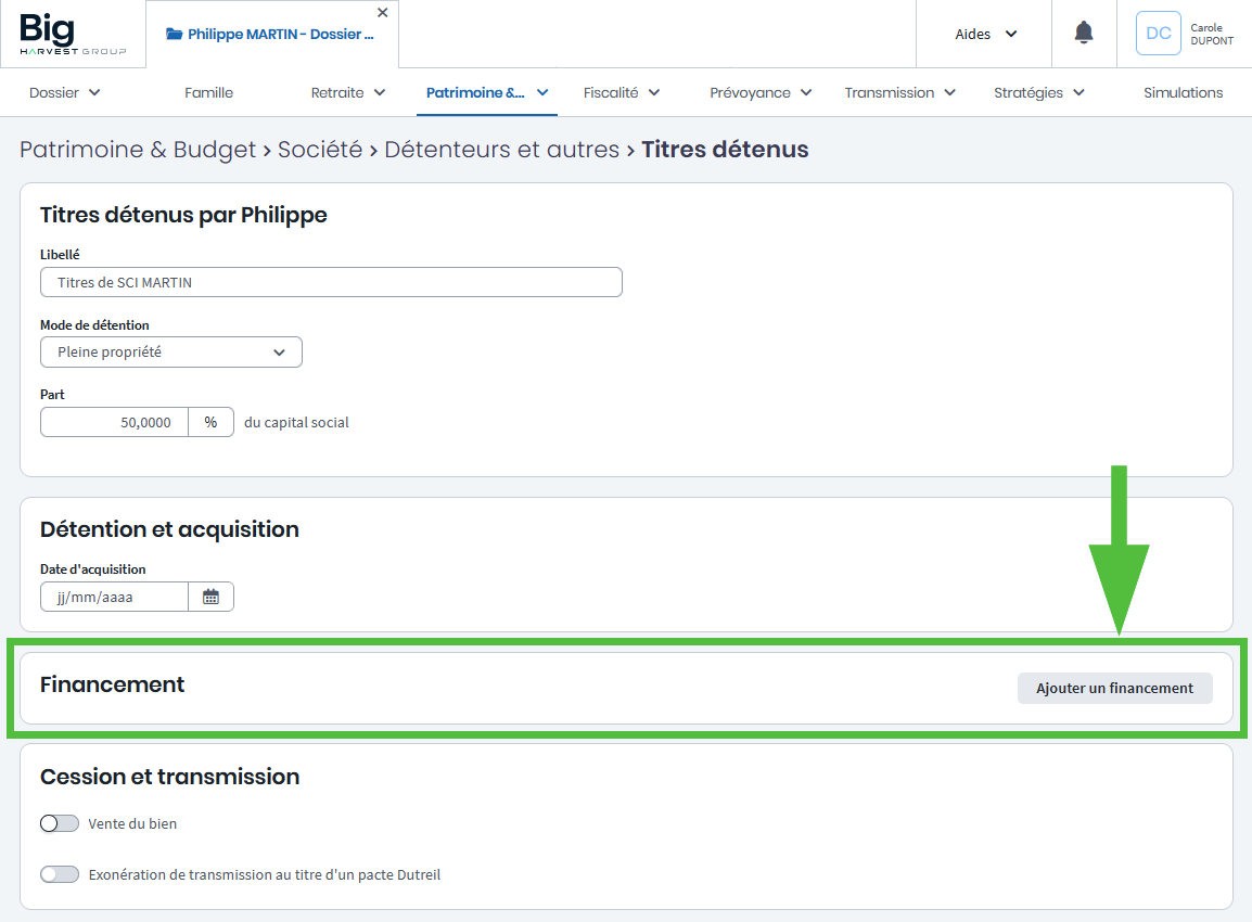 Ces financements souscrits par le client ou le conjoint alimentent les passifs du patrimoine et, comme pour les autres crédits, se répercutent dans les différents modules de Big.