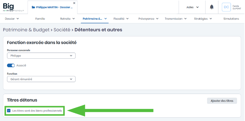 Lors de la saisie d’un détenteur, une case à cocher permet d’indiquer si ces titres constituent des biens professionnels. En cochant cette case, les titres de société sont rattachés à la famille « Biens professionnels » dans le patrimoine du client et sont considérés comme tels du point de vue de l’IFI.