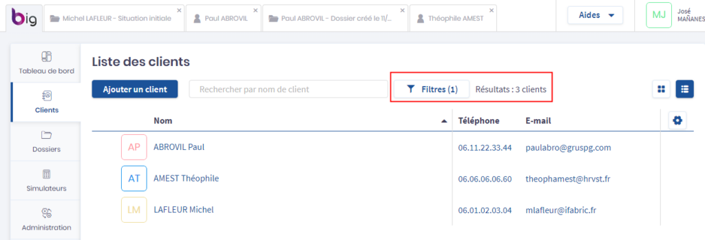 Pour vous donner des repères supplémentaires, par exemple lors du transfert de vos dossiers vers le nouveau Big, le nombre de clients est affiché dans la liste des clients.