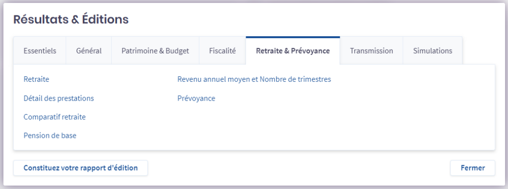 En cliquant sur le bouton « Résultats & éditions », vous êtes positionnés automatiquement sur l’onglet correspondant à celui consulté dans le dossier. Par exemple, si vous êtes sur la synthèse Retraite, en cliquant sur « Résultats & éditions », l’onglet propose « Retraite & prévoyance ».