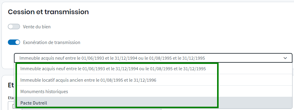 Les parts de SCI sont parfois considérées comme des biens professionnels et à ce titre, elles peuvent bénéficier de l’exonération de transmission « Pacte Dutreil ». Vous pouvez désormais le préciser dans la liste « Exonération de transmission » de l’actif « Parts de SCI ».