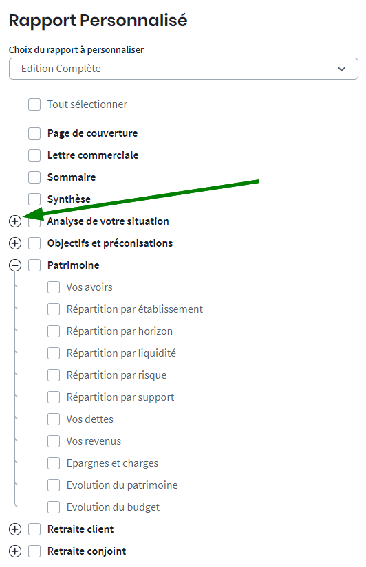A l’ouverture de l’écran, les chapitres sont repliés, vous donnant une vue d’ensemble du rapport choisi. En cliquant sur le « + » à gauche du nom du chapitre, les pages le composant s’affichent pour permettre de cocher celles qui vous intéressent.