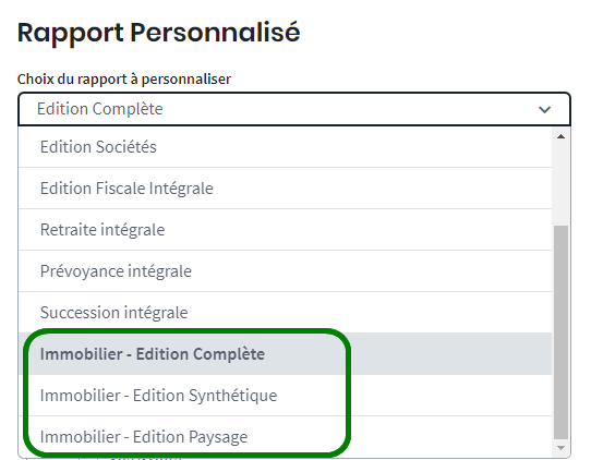Les pages du simulateur immobilier sont présentes dans le rapport « Edition complète » mais pour les sélectionner plus facilement, Big propose les 3 rapports du simulateur immobilier directement dans la liste des rapports à personnaliser.