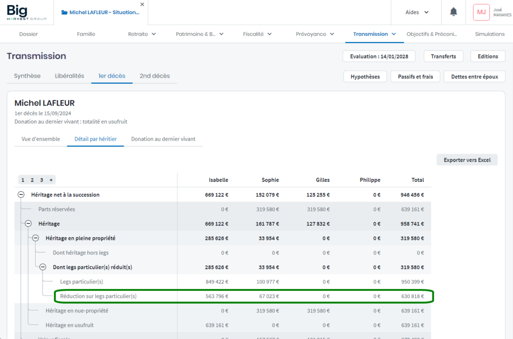 Pour vous aider à mieux comprendre les calculs effectués par Big en présence d’un legs particulier réduit, Big affiche le montant initial du legs et la part réduite lorsque le legs excède la quotité disponible. Vous retrouvez ces montants dans le détail par héritier, en sous-niveau de la ligne « Dont legs particulier(s) réduit(s) ».