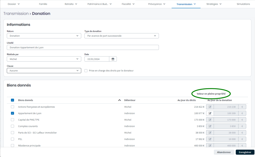Les petits repères font gagner du temps, c’est pourquoi nous avons précisé dans le bloc « Biens donnés » que le montant affiché est une valeur en pleine propriété, évitant ainsi toute confusion.