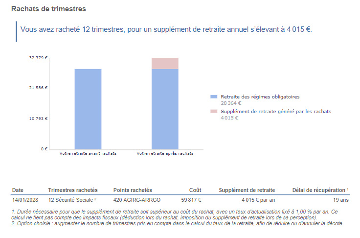 Pour mieux contextualiser le supplément de retraite apporté par un rachat de trimestres, le graphique « Rachats de trimestres » affiche le montant intégral des pensions de retraite en plus du rachat lui-même.