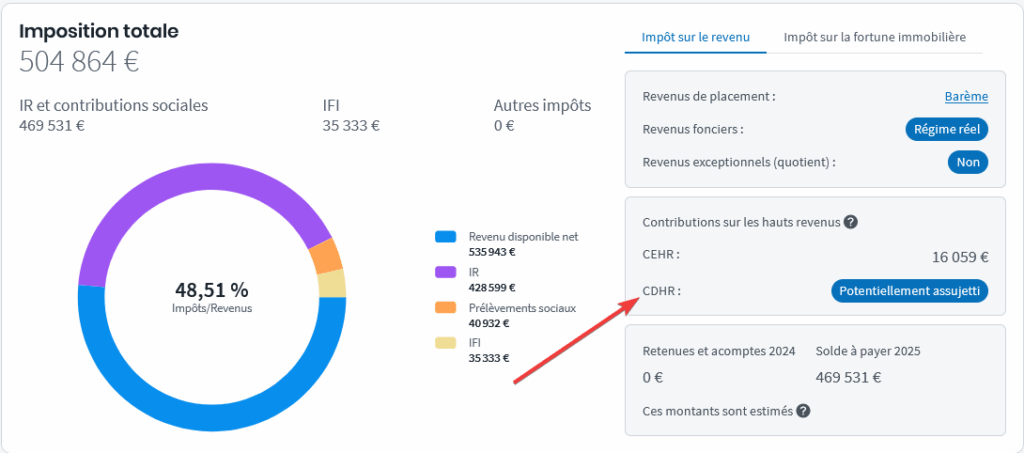 L’assujettissement à la CDHR repose sur le revenu fiscal de référence (RFR), ajusté par certains retraitements spécifiques. Actuellement, le calcul détaillé de la CDHR est en cours de développement par nos équipes. En attendant, cette estimation se base uniquement sur le revenu fiscal de référence.