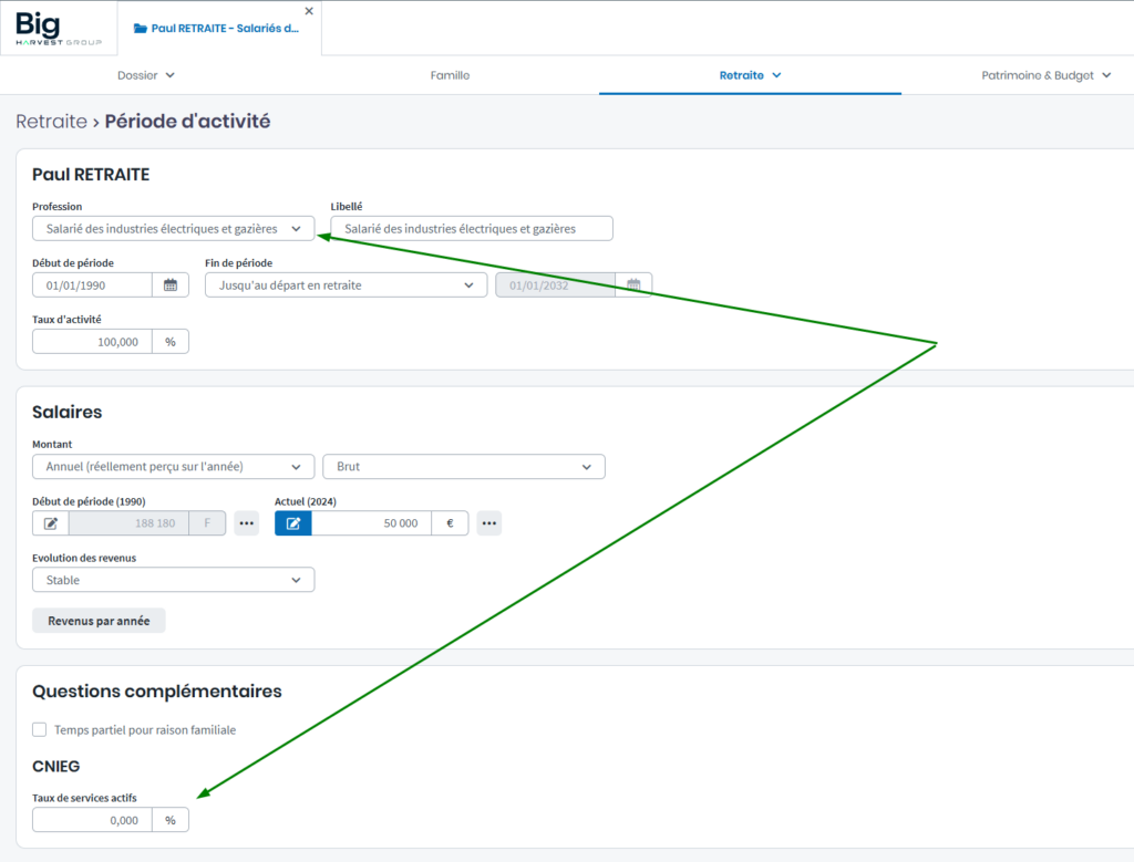 Afin de gérer les spécificités de vos clients cotisants au régime spécial CNIEG lors de leur carrière, Big propose une nouvelle profession « Salarié des industries électriques et gazières ». Comme pour toutes les professions dans Big, il va de soi que son incidence en termes de retraite et de prévoyance est prise en compte.