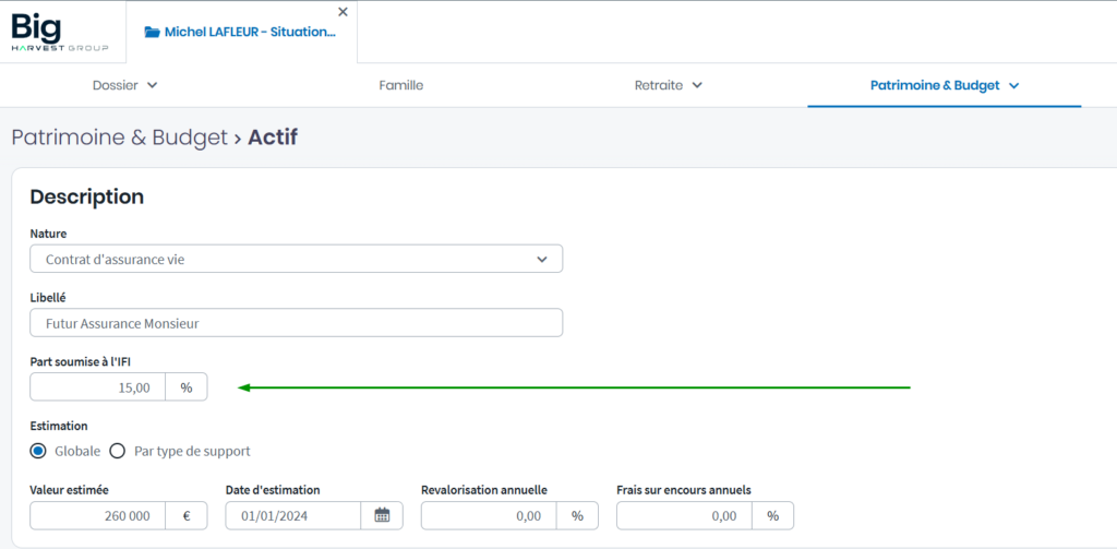 Ce champ détermine le montant transféré dans la déclaration de l’Impôt sur la Fortune Immobilière (IFI) à partir de la valeur estimée de l’actif. Pour mémoire, la valeur estimée d’un actif peut être renseignée ou évaluée par Big à partir des informations renseignées (montant d’acquisition, taux de revalorisation, etc).