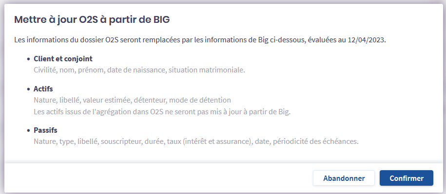 Les données mises à jour dans O2S s’affichent, il vous suffit de cliquer sur Confirmer pour lancer la mise à jour.