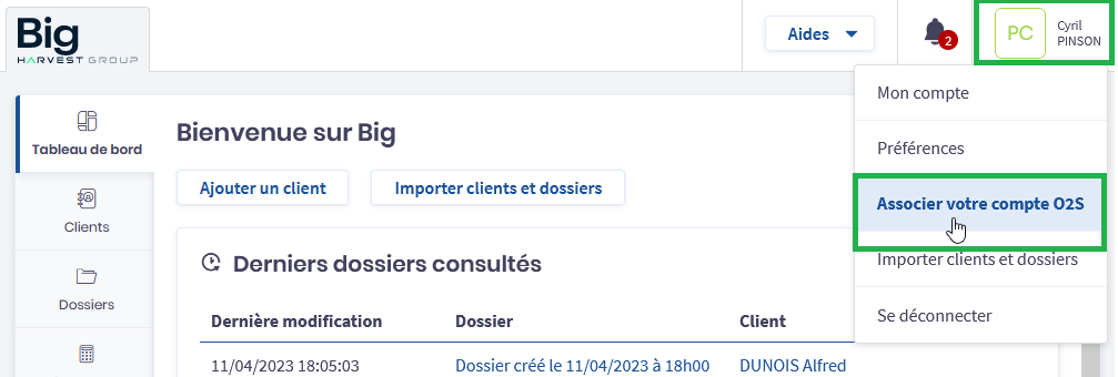 Une fois vos comptes associés, vous pouvez échanger les données de vos clients : créer un dossier dans Big ou O2S, et mettre à jour les clients présents dans les 2 applications.