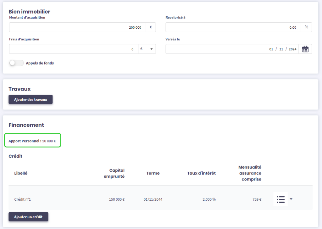 En l’absence de crédit, il est nécessaire de cliquer sur le bouton « Calculer » pour afficher le montant de l’apport personnel.