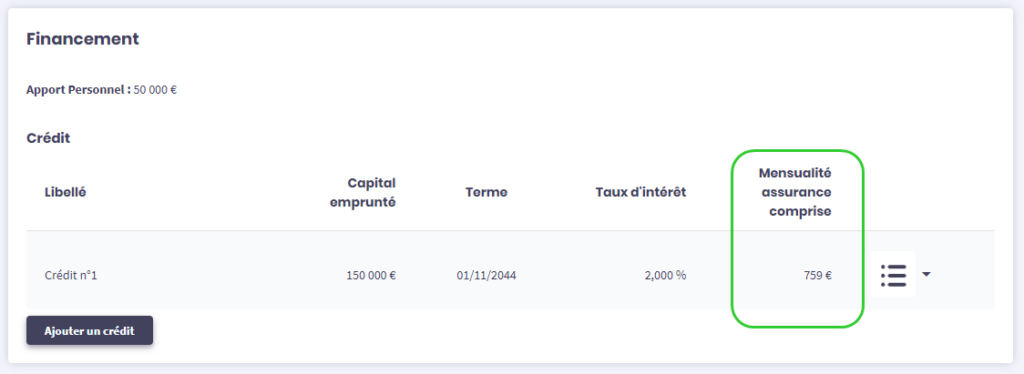 Dès la validation des saisies d’un crédit, l’échéance mensuelle est calculée et affichée sur la ligne du crédit dans le bloc « Financement ». Le montant indiqué dans la colonne Mensualité assurance comprise correspond à la première échéance complète du crédit en prenant en compte l’assurance.